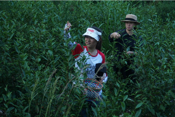 孟子居霞暖乡情实践团成员学习采摘茶叶。受访者供图