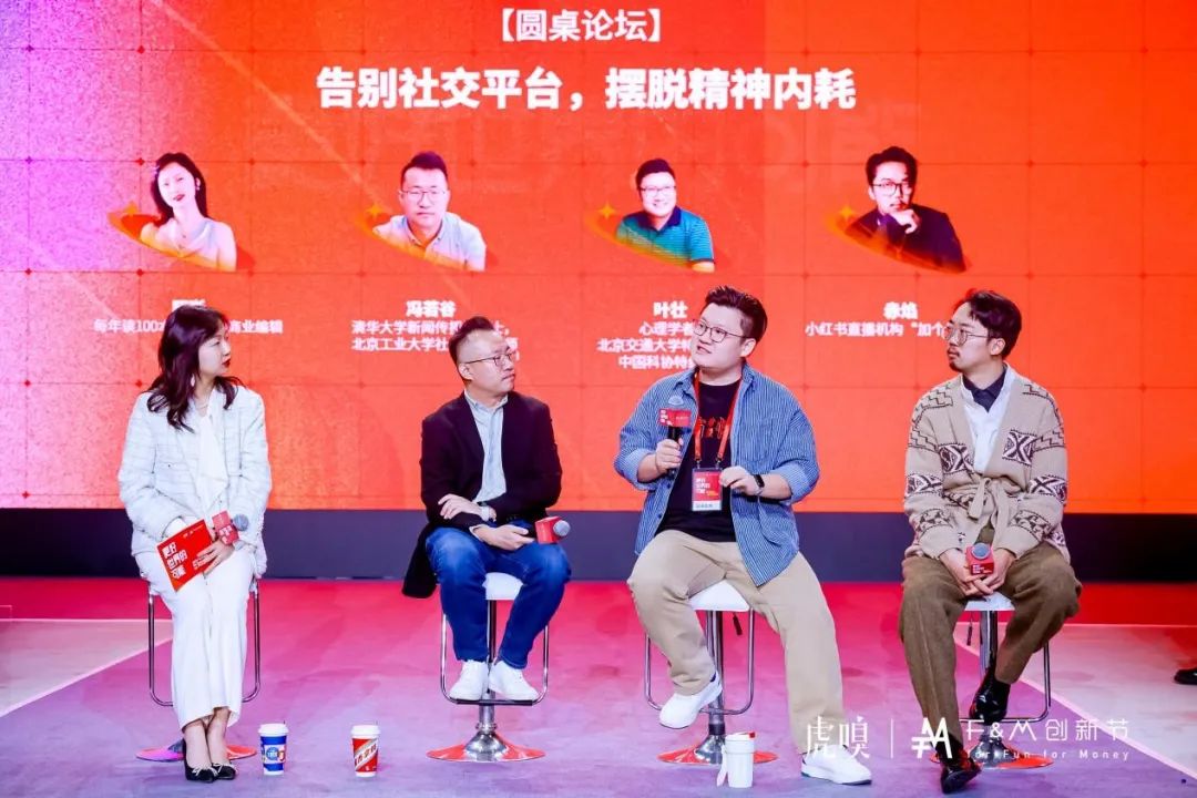 此外,F展馆的上午场嘉宾演讲分享主题也是十分夺人眼球,有据核查主理人魏星、《财新周刊》专栏作者陈迪、分别带来不同特色主题的分享讨论。之后,虎嗅商业编辑昭晰与清华大学新闻传播系博士、北京工业大学社会学系讲师冯若谷、中国科协特约专家叶壮、小红书直播机构“加个灵”CEO赤焰进行关于“告别社交平台,摆脱精神内耗”为主题的圆桌讨论。结束后,还有来自哲学、宠物领域等多维主题的特邀嘉宾带来有趣精彩的话题分享。