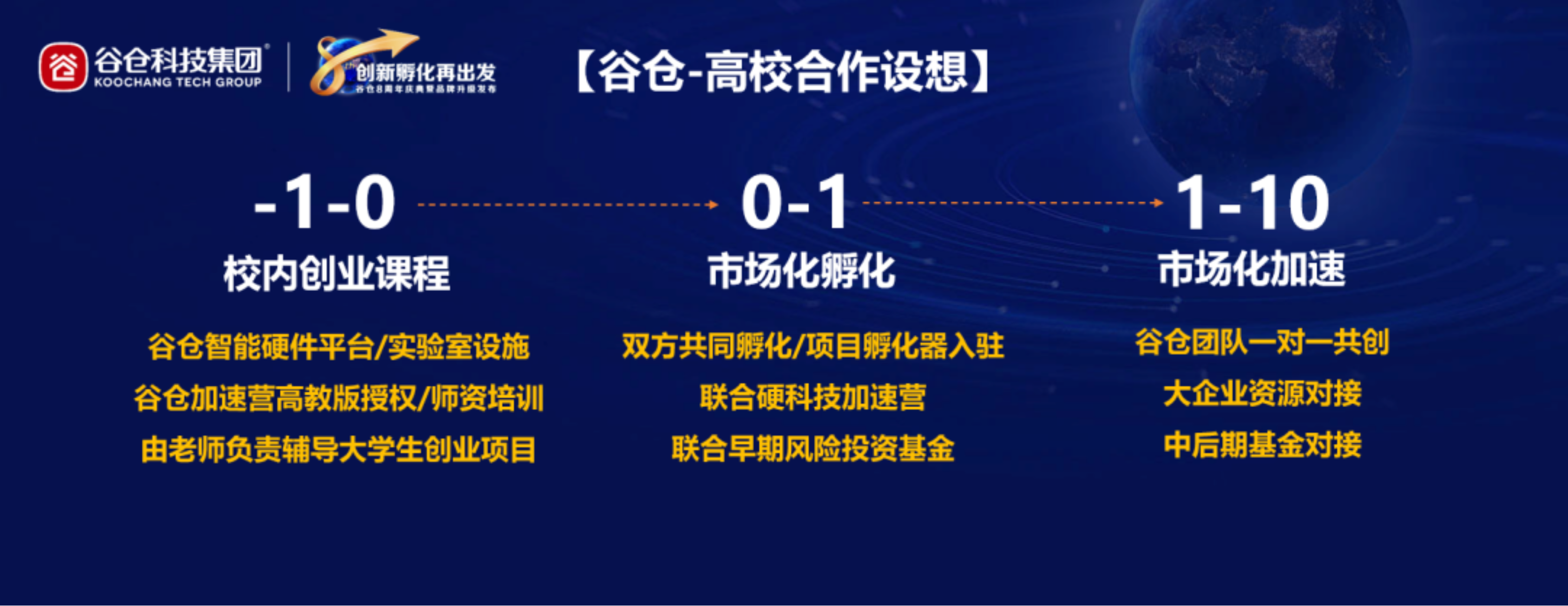 最后,关于谷仓与高校未来的合作方向,洪博士也提出了自己的设想:“-1到0”阶段重心是校内创业课程,主要由高校教师负责辅导大学生创业项目,谷仓可以提供智能硬件平台和实验室设施;“0到1” 阶段是市场化孵化,谷仓可以和高校联合共同孵化项目,并通过硬科技加速营和早期投资等方式,提高项目成活率;“1-10”阶段是市场化加速,主要由谷仓团队一对一辅导共创,对接大资源、大平台、大基金,让企业真正成为赚钱又值钱的企业!