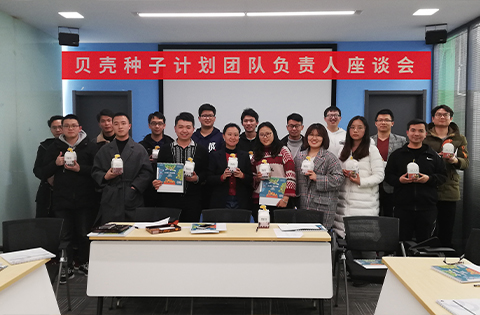 贝壳种子计划团队负责人座谈会于2019年12月24日晚在贝壳创空间路演报告厅召开。参加会议的有创空间15支入驻团队负责人,创新创业中心副主任王丽红和指导教师邓张升、王琪。